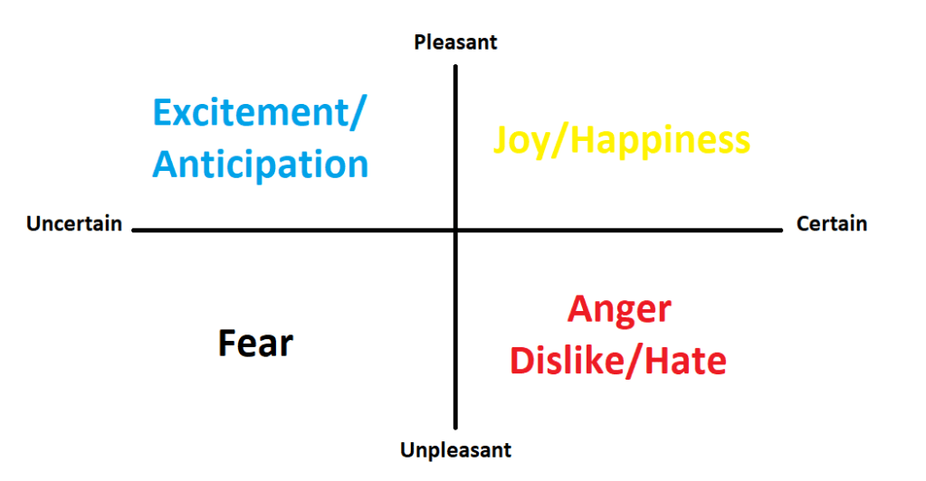 With these conclusions taken together, we arrive at our (partial) definition of fear: It is an unpleasant emotion we experience when faced with the possibility of pain. If it is not uncertain, it is dislike or hatred. If it is not painful, it is excitement or anticipation. If it is neither, then it’s enjoyment or happiness. This is illustrated in this very simplistic chart I’ve made (Obviously not every emotion is represented on this chart, like disgust or guilt or hunger, and often these emotions can blend with each other, but this serves my present purposes):